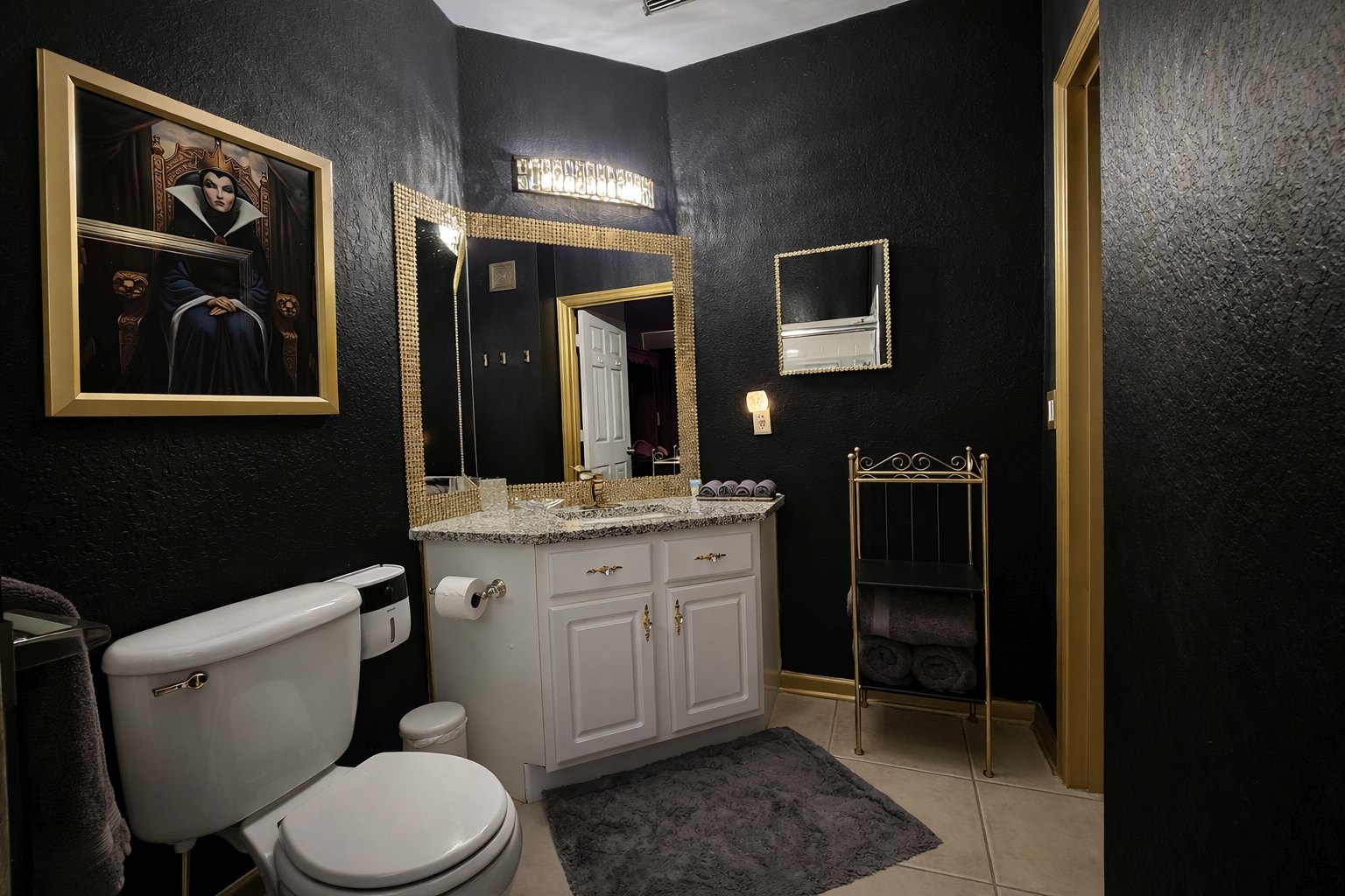 Our EVIL QUEEN'S ROYAL SUITE features a bed so grand, it's fit for a Queen! With it's soaring lighted canopy, adorned in royal purple (of course) and red velvet, the luxury you'll experience is beyond compare. The king sized bed is a sanctuary reserved for our most regal guests. Of course, The QUEEN'S THRONE ROOM is en suite, where you'll find gleaming, gilded appointments suitable for royalty. Why be a princess when you can be a Queen?